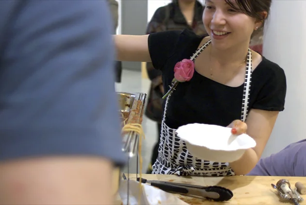 IMAGE - Gossiaux serving spaghetti into a handmade ceramic bowl. Emilie Gossiaux, Spaghetti Night, 2014. Image courtesy the artist.