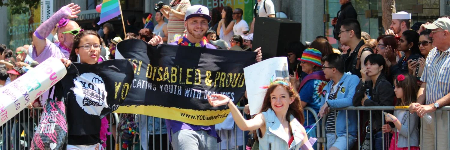 IMAGE: Image people cheering and holding banners from the Disability Pride Parade, 2014