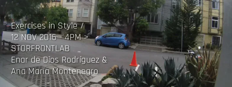 Exercises in Style is an experimental live fictional film created from streaming security camera feeds located in the Bay Area and available online. There will be four versions of the film. All of them will use the same camera feeds and will tell the same story (through text displayed on top of the images), but will vary in their style and form. Both the screenings and the edition of the films will happen live at StoreFrontLab.