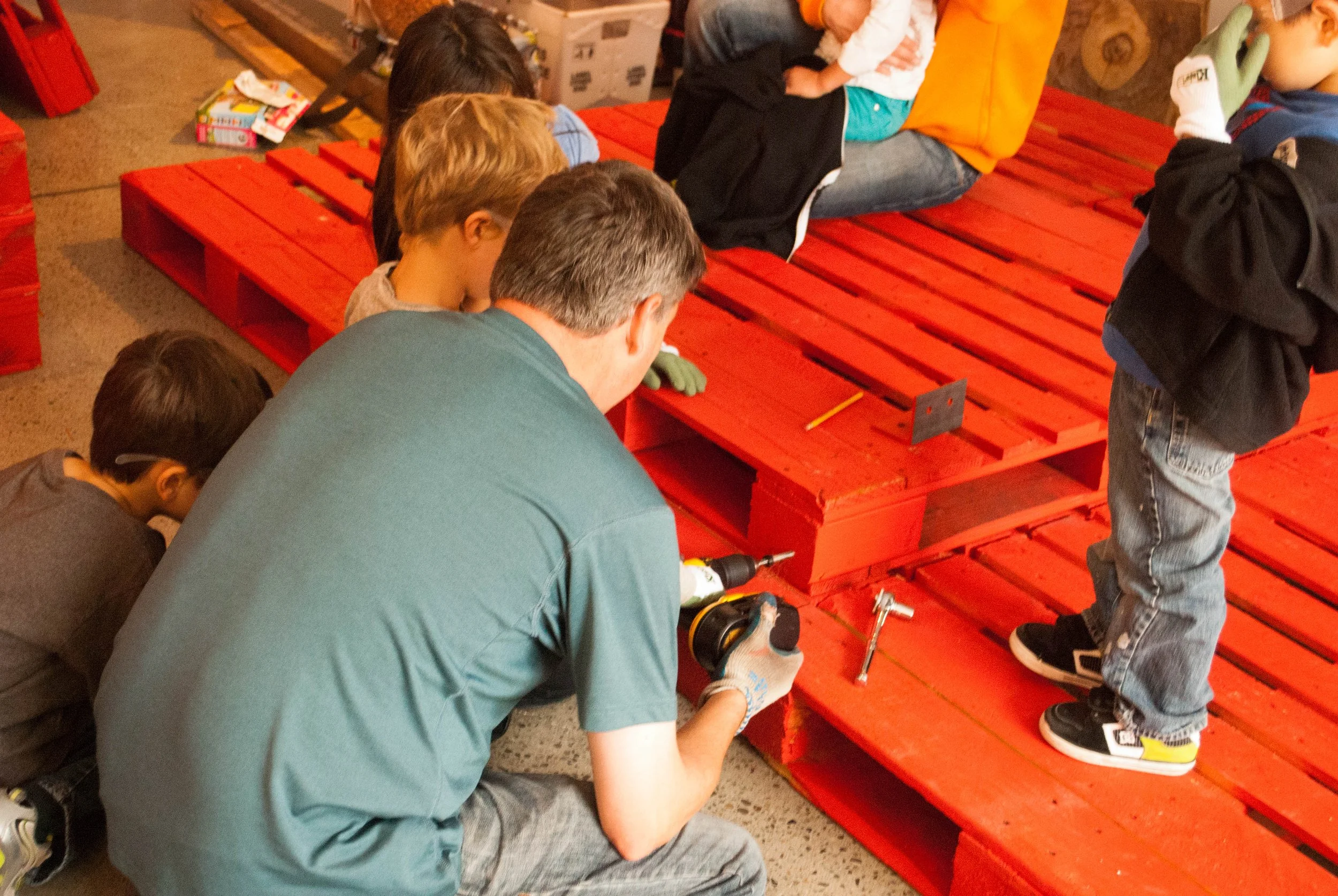 /Architect Steve Walker hosted this design-build workshop engaging children in the creating of a temporary, play space made from shipping pallets. October 13-28, 2012